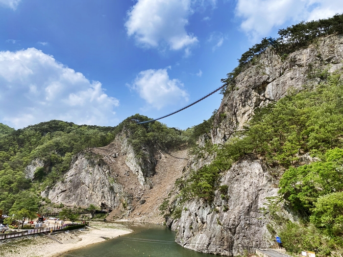 강원도 원주시 지정면 간현관광지 소금산 등산로입구에서부터 바위오름터 구간에 설치된 원주 소금산 출렁다리 입니다.